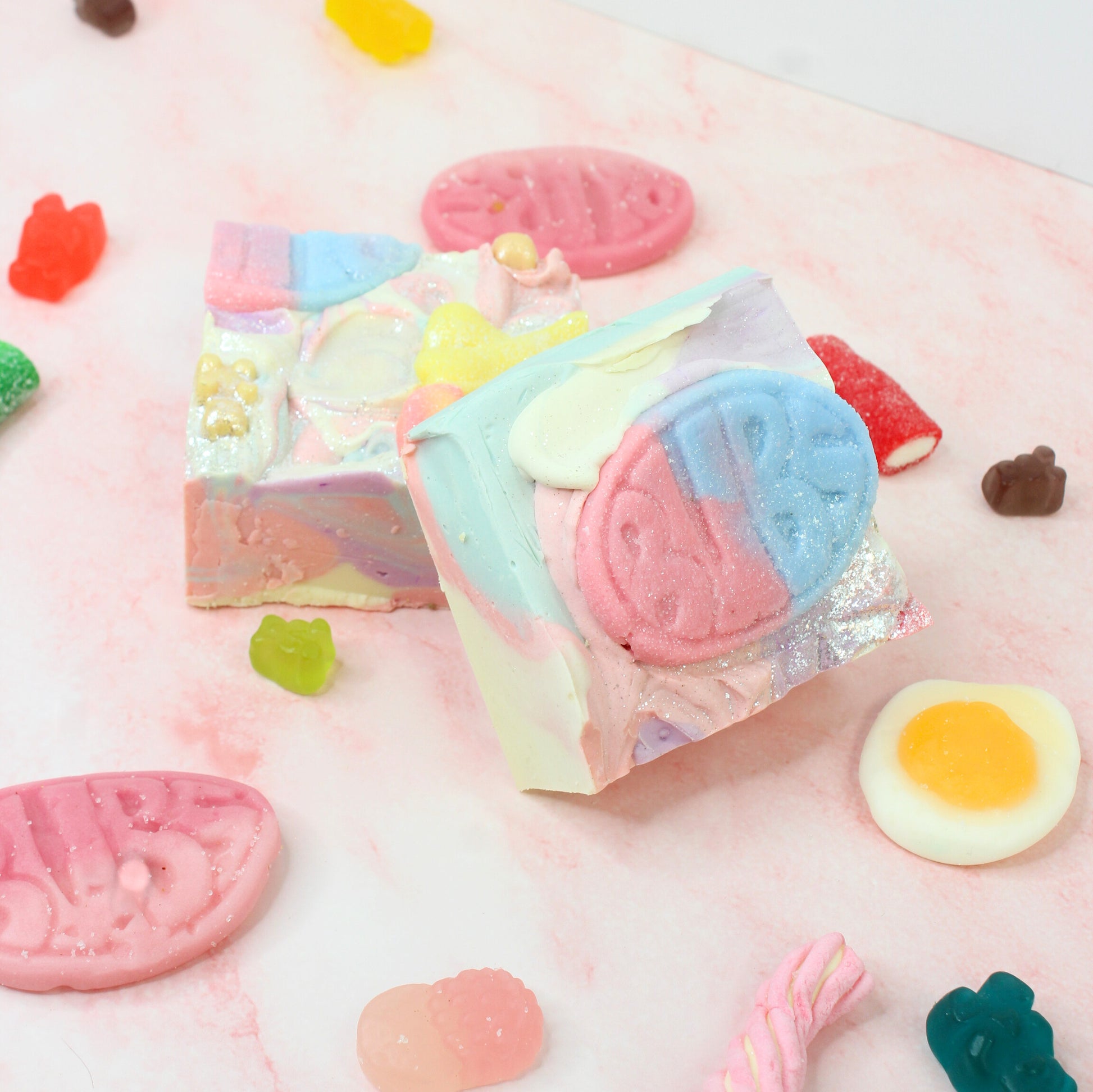 Each handcrafted soap bar is adorned with BUBS inspired swedish candy and gummy bears. EACH PEICE WILL BE DIFFERENT.